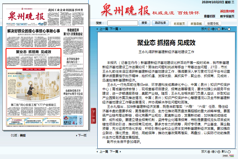 王永礼一行先后前往海归e谷、九州酷游ku游科技成果转化中心、中国(泉州)知识产权保护中心(育成基地综合楼),现场查看项目建设、招商进展等情况,要求加强公共服务平台建设,进一步畅通服务链,集聚产业链。随后,王永礼与相关部门负责人座谈,听取知创产业园策划方案及推进情况、中国(泉州)知识产权保护中心筹建情况以及全市新基建新经济基地建设工作等进展情况,并协调解决存在问题和困难。